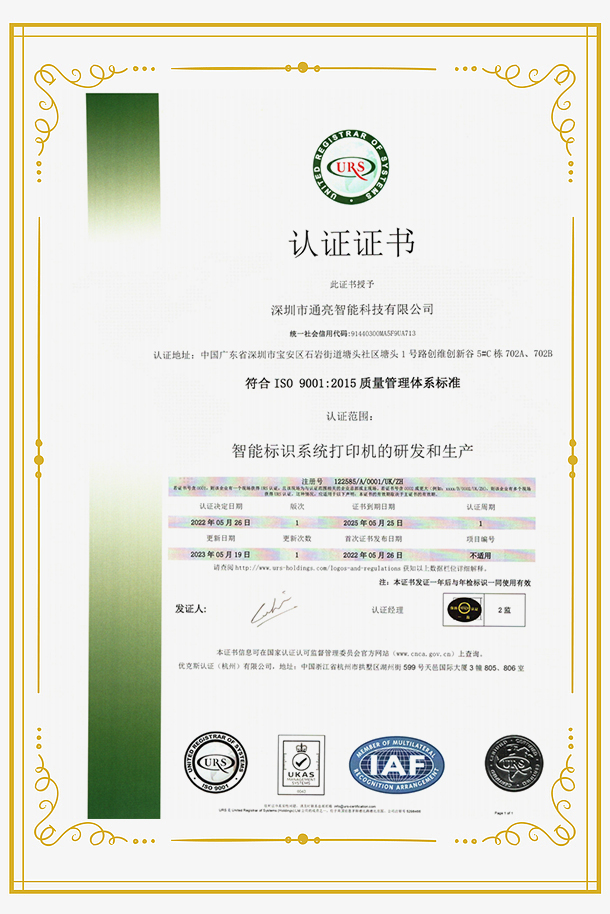 熱(rè) 烈 慶 祝 通(tōng) 亮(liàng) 智 能(néng) 獲 得(de) ISO9001 認 證 證 書(shū)